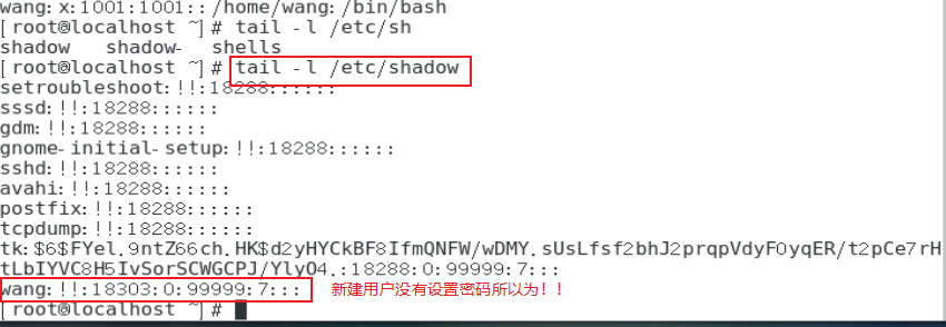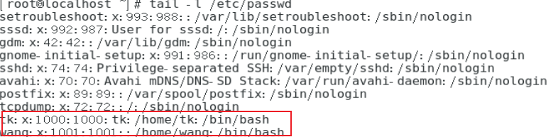 tail-l查看用户/etc/passwd和/etc/shadow文件,前者用于查看新建目录用户信息,后者用于查看用户密码信息。